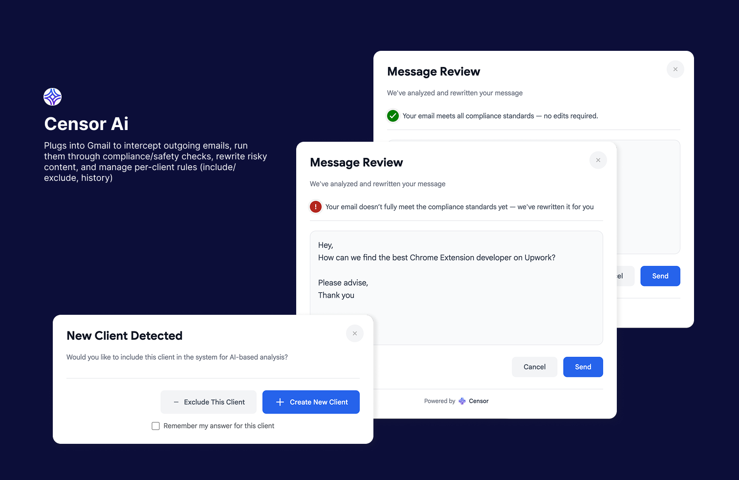 Censor AI is a smart Chrome extension that revolutionizes email writing on Gmail. Simply type your message, and Censor AI suggests a professionally rewritten version using OpenAI's powerful API. You can send the AI-enhanced email instantly or fine-tune it before sending. Perfect for crafting professional, clear, or friendly emails with ease—making email communication smarter and more efficient.